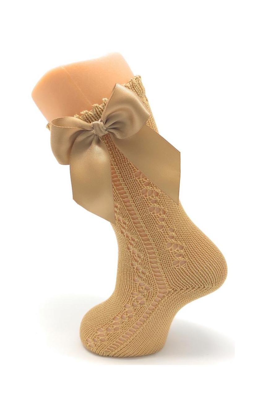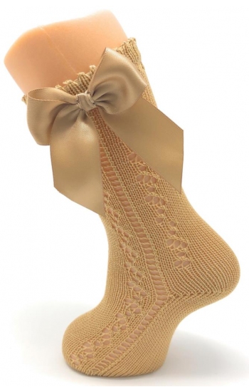 Knee High Openwork socks with Bow in perle cotton with polyamide for more elasticity. Available in a wide variety of colors from size 000 (0-3 months) to 6 years. COMPOSICIÓN: 80% COTTON, 20% POLYAMIDE