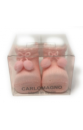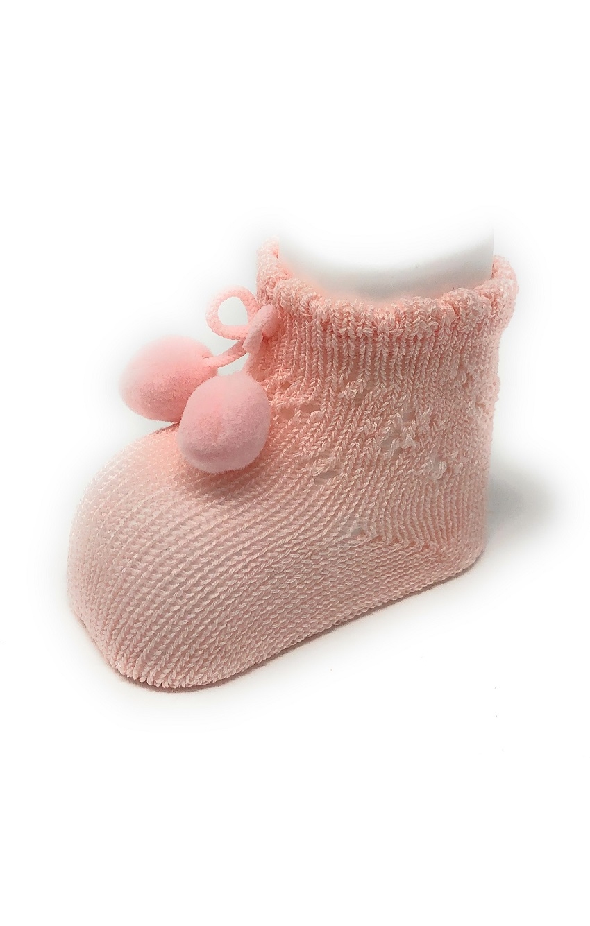 Openwork socks with pompoms for newborn made in Spain in perle cotton with polyamide for more elasticity. Available in various colors and One Size RN (Newborn). Packed in a gift box. COMPOSICIÓN: 78% COTTON, 20% POLYAMIDE, 2% ELASTANE