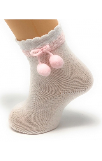 Socks with Pompoms in fine mercerized cotton with polyamide for more elasticity, fresh and comfortable texture. Available in a wide variety of colors and from size 000 (0-3 months) to 6 years. COMPOSICIÓN: 75% COTTON, 25% POLYAMIDE