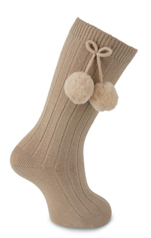 Rib Knee-high socks with Pompoms in combed cotton with elastane for better comfort. Available in a wide variety of colors and from size 00 3-6 months to 8 years. COMPOSICIÓN: 78º/ₒ COTTON. 20º/ₒ POLYAMIDE. 2º/ₒ ELASTANE