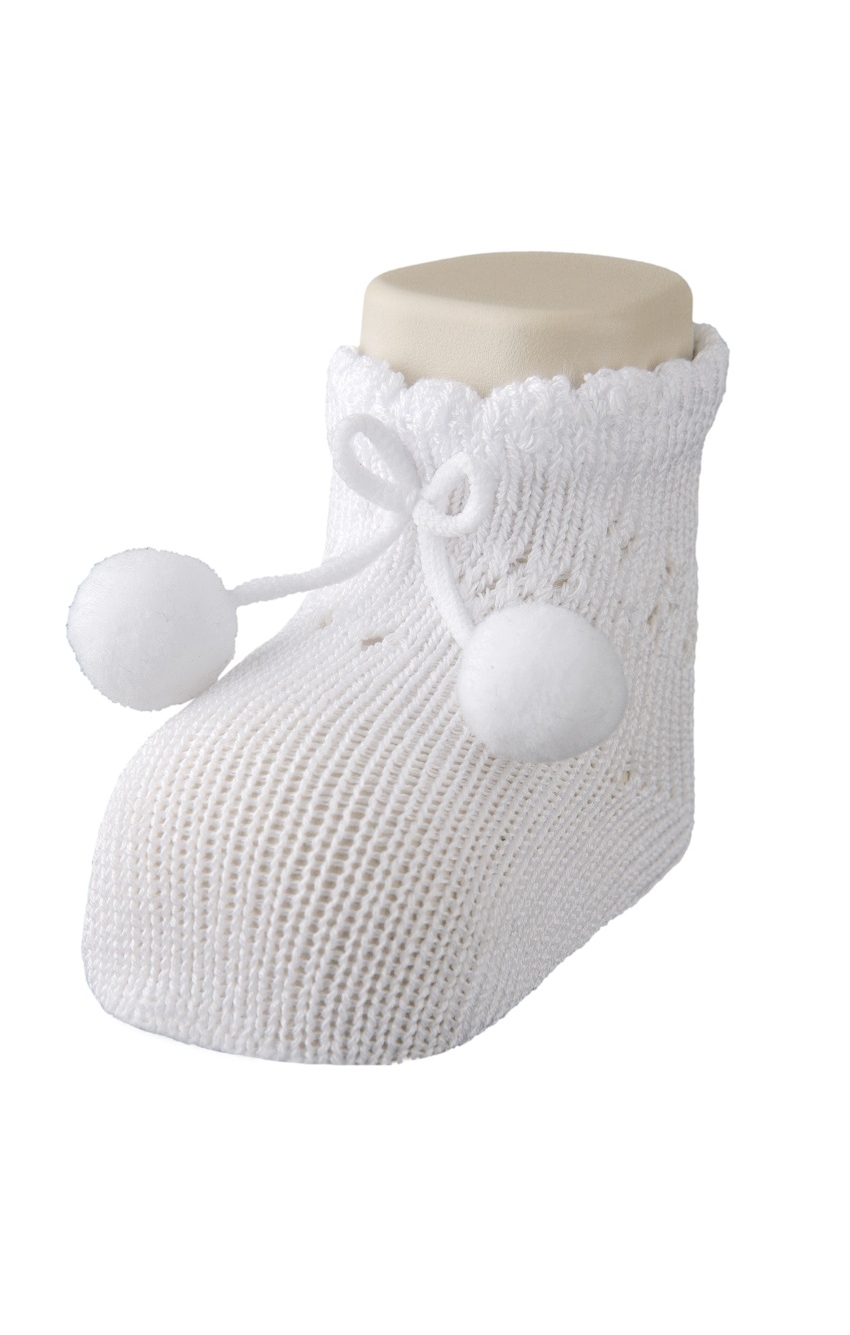 Calcetines calados con borlas para recién nacido fabricados en España en hilo perlé con poliamida para más elasticidad. Disponibles en varios colores y Talla Única RN (Recién Nacido). Encajado en estuche regalo. COMPOSICIÓN: 78%ALGODON/COTTON, 20%POLIAMIDA/POLYAMIDE, 2%ELASTANO/ELASTANE