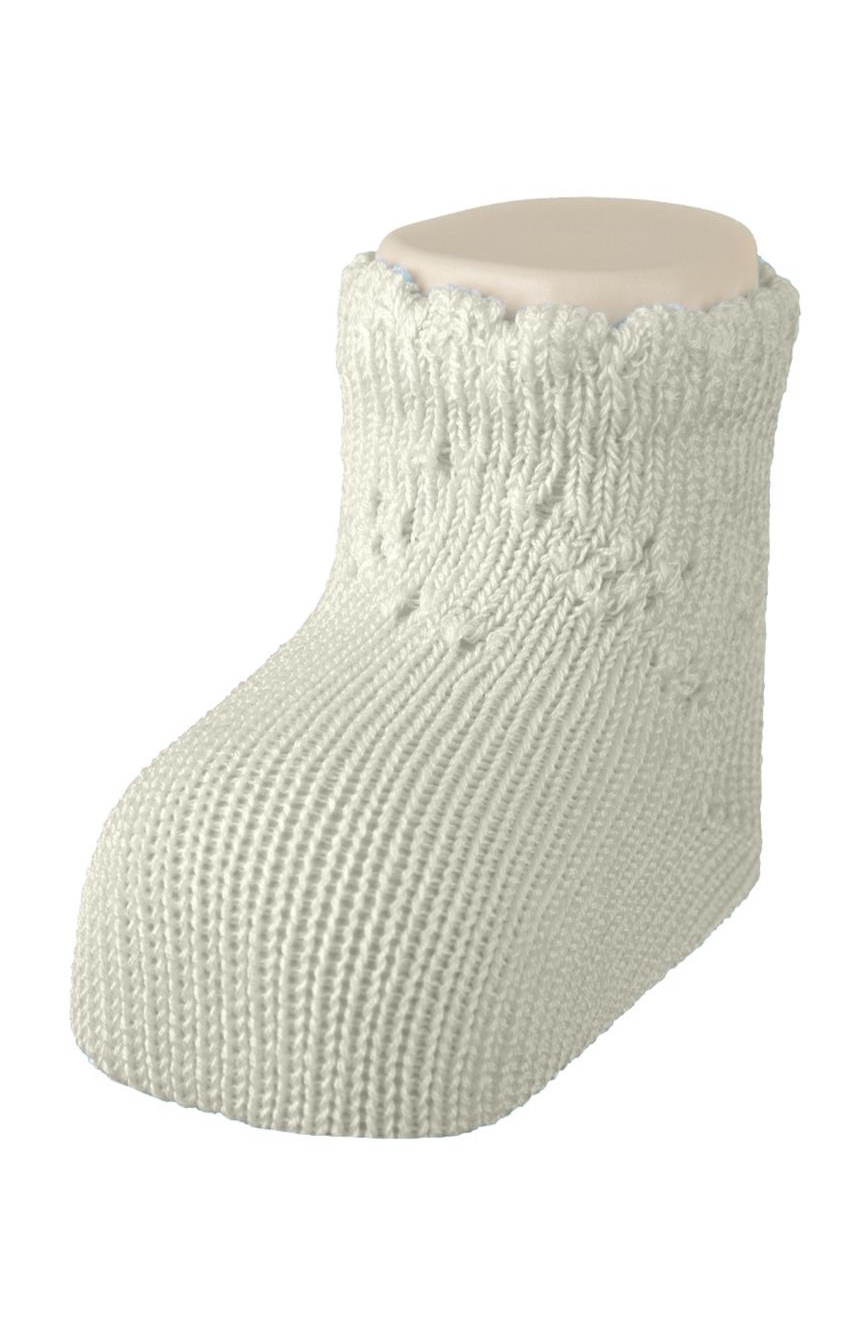 Calcetines calados para recién nacido fabricados en España en hilo perlé con poliamida para más elasticidad. Disponibles en varios colores y Talla Única RN (Recién Nacido). Encajado en estuche regalo.