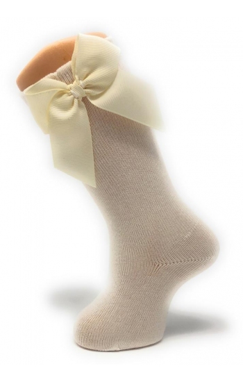 Calcetines altos con lazo gros-grain en algodón peinado con elastano para mayor comodidad. Disponibles en una gran variedad de colores y desde la talla 00 3-6 meses hasta los 8 años.