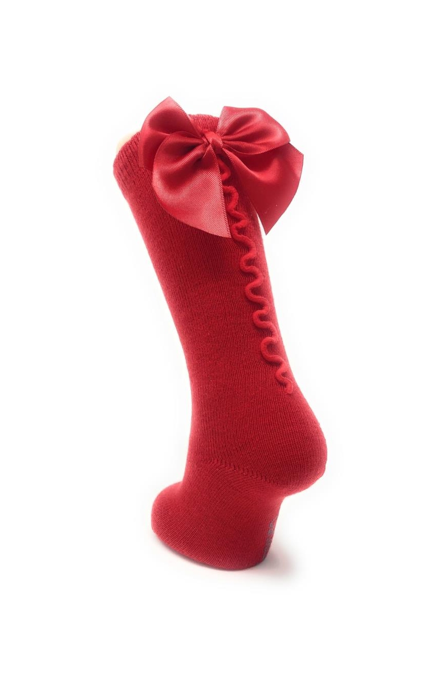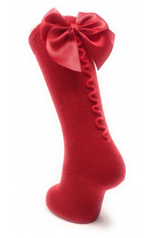 Calcetines altos con lazo y costura posterior en algodón peinado con elastano para mayor comodidad. Disponibles en una gran variedad de colores y desde la talla 00 3-6 meses hasta los 8 años.