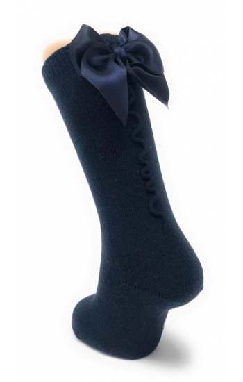 Calcetines altos con lazo y costura posterior en algodón peinado con elastano para mayor comodidad. Disponibles en una gran variedad de colores y desde la talla 00 3-6 meses hasta los 8 años.