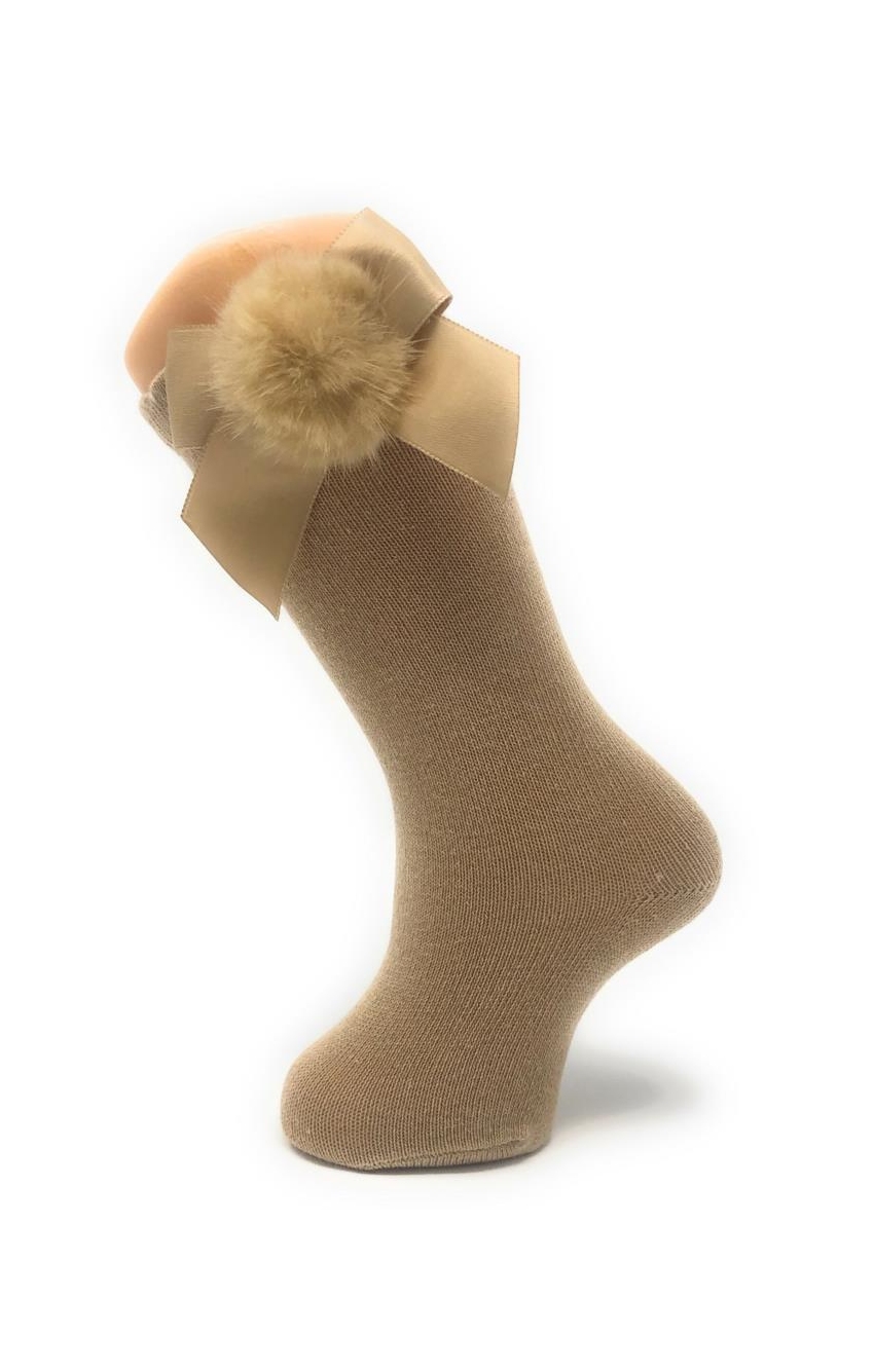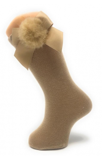 Calcetines altos con pompón sobre lazo en algodón peinado con elastano para mayor comodidad. Disponibles en una gran variedad de colores y desde la talla 00 3-6 meses hasta los 8 años.