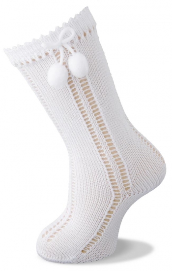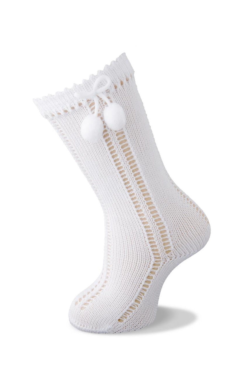 Calcetines Altos Calados con Borlas en hilo perlé con poliamida para más elasticidad. Disponibles en una gran variedad de colores desde la talla 000 (0-3 meses) hasta los 6 años.
