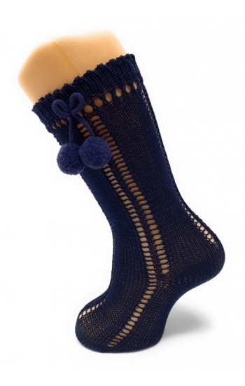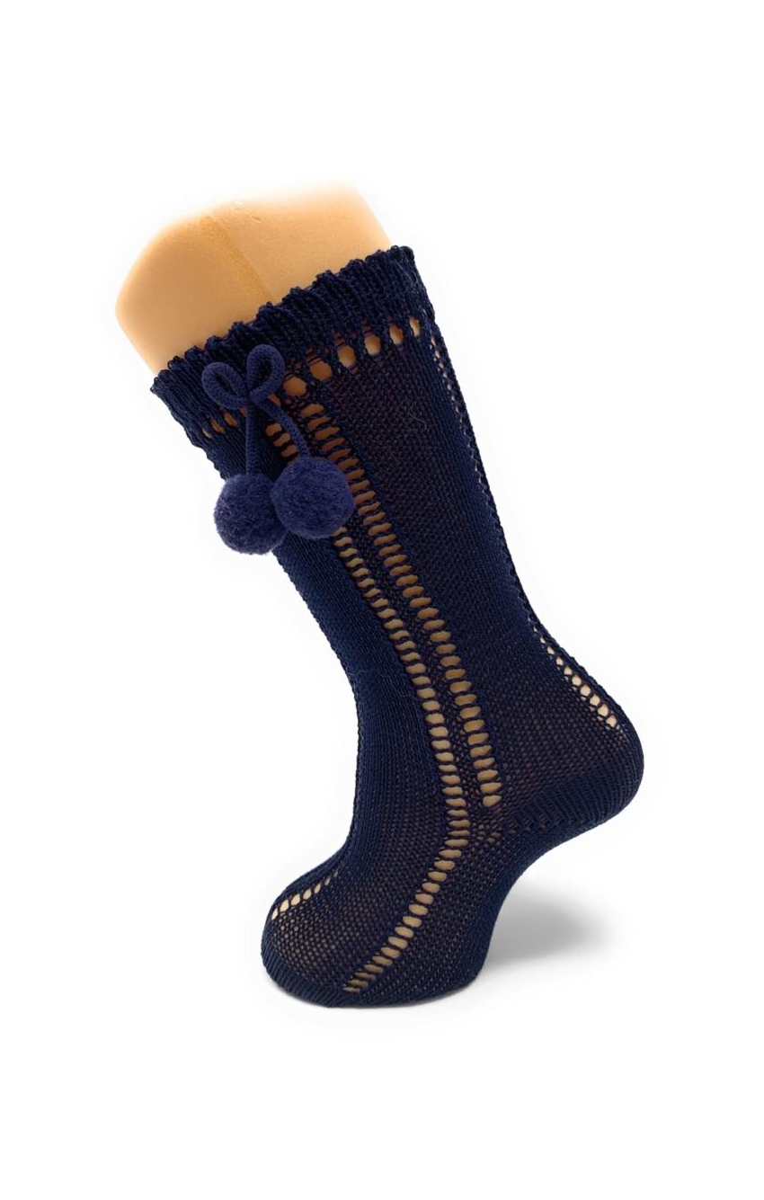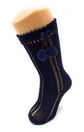 Calcetines Altos Calados con Borlas en hilo perlé con poliamida para más elasticidad. Disponibles en una gran variedad de colores desde la talla 000 (0-3 meses) hasta los 6 años.