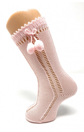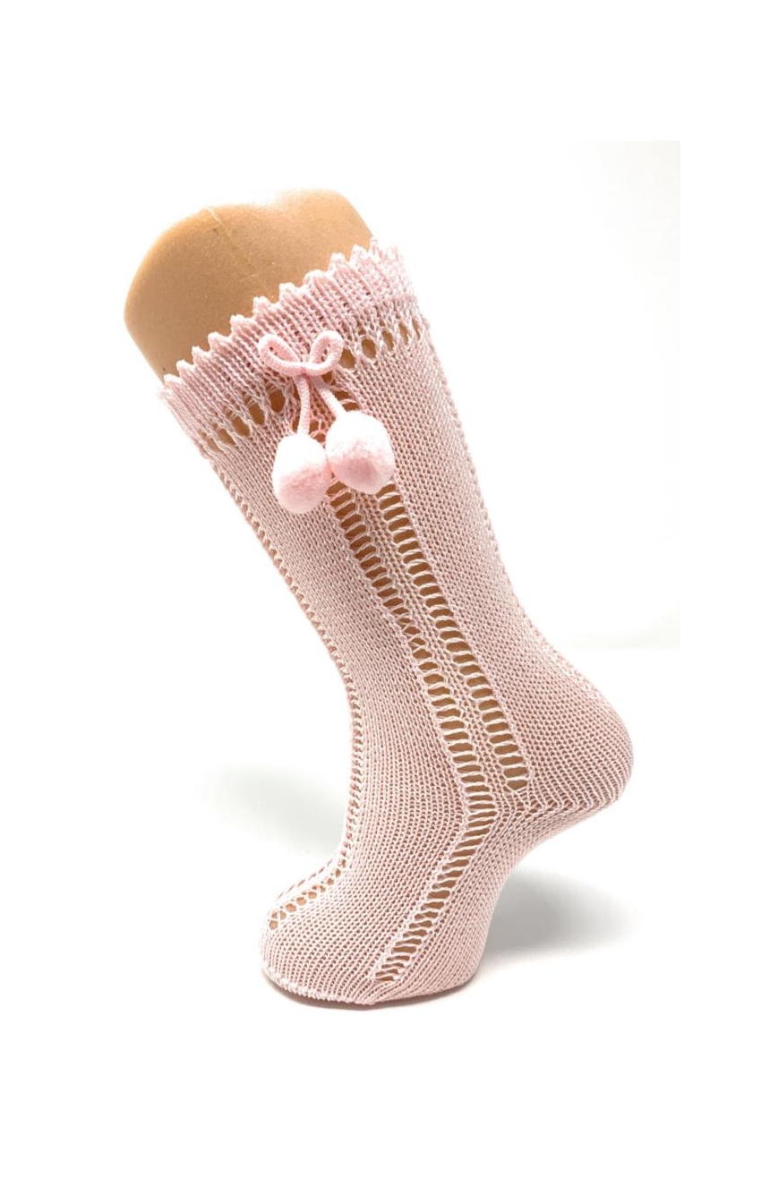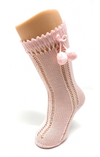 Calcetines Altos Calados con Borlas en hilo perlé con poliamida para más elasticidad. Disponibles en una gran variedad de colores desde la talla 000 (0-3 meses) hasta los 6 años.