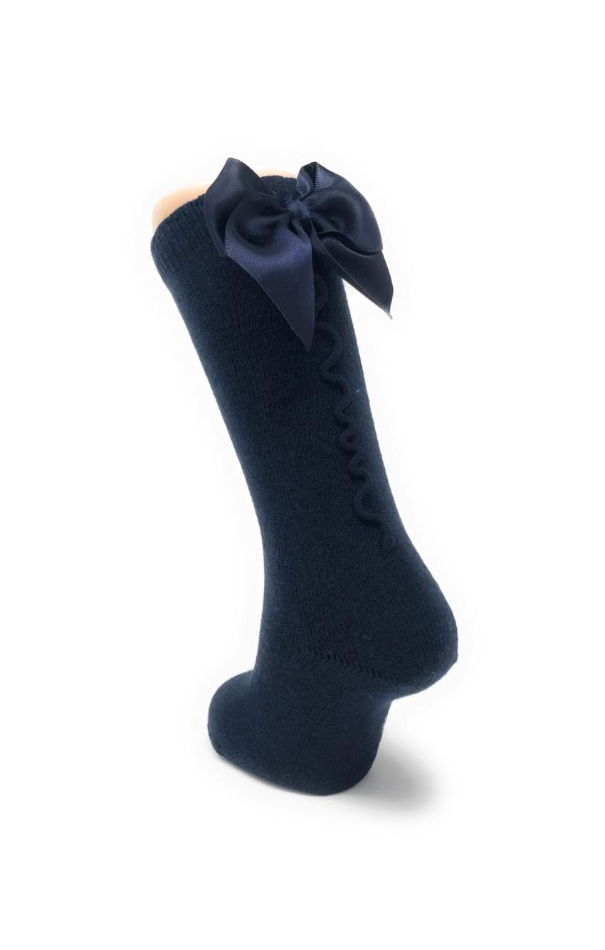 Calzini al ginocchio con fiocco e cucitura posteriore in cotone pettinato con elastan per un maggiore comfort. Disponibile in un'ampia varietà di colori e dalla taglia 00 3-6 mesi a 8 anni.