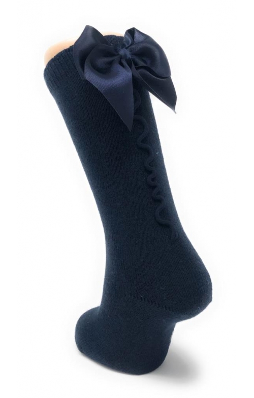 Calzini al ginocchio con fiocco e cucitura posteriore in cotone pettinato con elastan per un maggiore comfort. Disponibile in un'ampia varietà di colori e dalla taglia 00 3-6 mesi a 8 anni. COMPOSICIÓN: